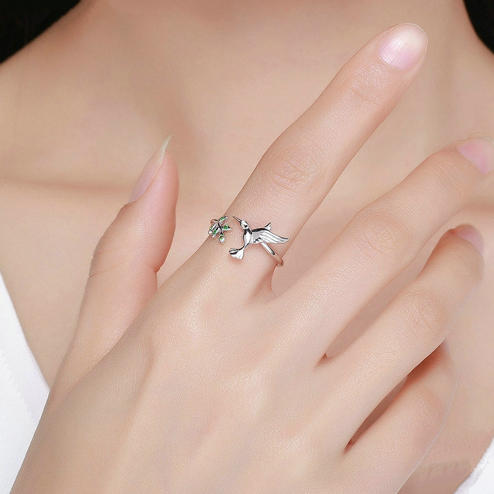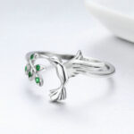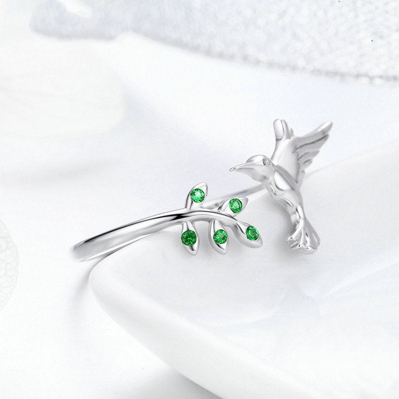 Bague Colibri en argent 925 plaqué or blanc avec zircons verts ajustable